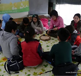 민서, 시후, 형민, 유진, 윤기, 우성, 진환, 해민, 영우, 그리고 가족행사 때문에 오지 못한 병모까지....... 조약돌 모둠의 아이들입니다. 우성이와 윤기, 유진이는 작년에 들살이를 했던 아이들이고 민서, 시후, 형민, 진환, 해민, 영우는 오늘이 처음이라 초반에 서먹서먹했지만 아이들은 금새 적응을 합니다. 애기능 낚시터에 버스에서 내려 산들학교까지 걸어오면서 서로 서로 친해지고 터전에서 "다 봄님이에요." 노래를 배우면서 긴장했던 마음도 풀어지고 모둠끼리 나가서 풀, 꽃, 올챙이와 놀면서 모두 모두 친구가 됩니다. 친한 친구와 떨어져서 울상이었던 시후도 금방 밝아졌어요. 쑥 뜯어서 한입 먹어보고 제비꽃도 먹고 애기똥풀로 메니큐어 놀이도 해보고 개나리머리핀도 머리에 꽂고 두꺼비의 올챙이를 만나러..